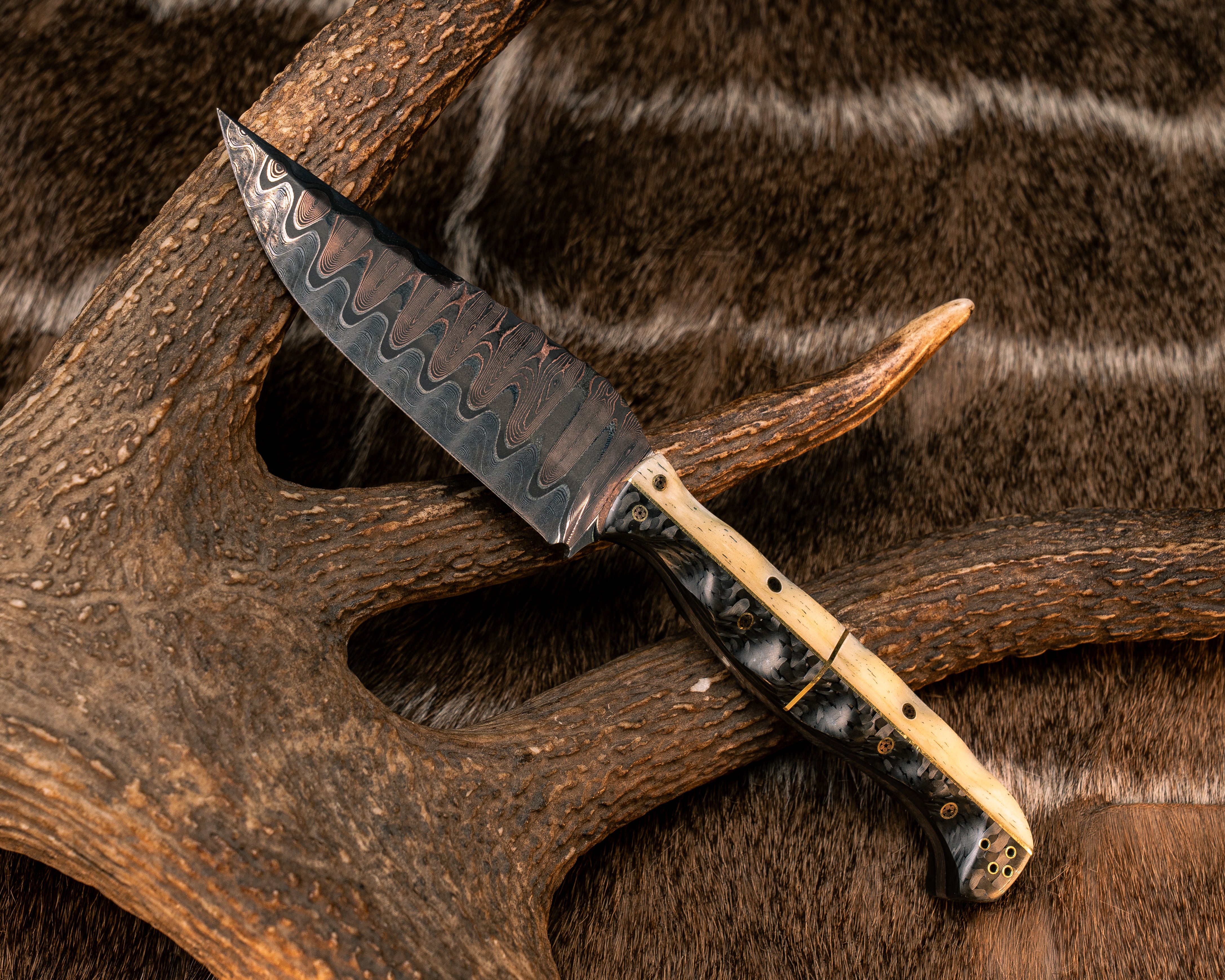 Crow Pre-Jay- Baker Forge Ladder Pattern CopperMai- Giraffe Bone and Carbon with Brass Split, 1/8" Mosaic Pins, Brass Lanyard Pins, Textured Grip