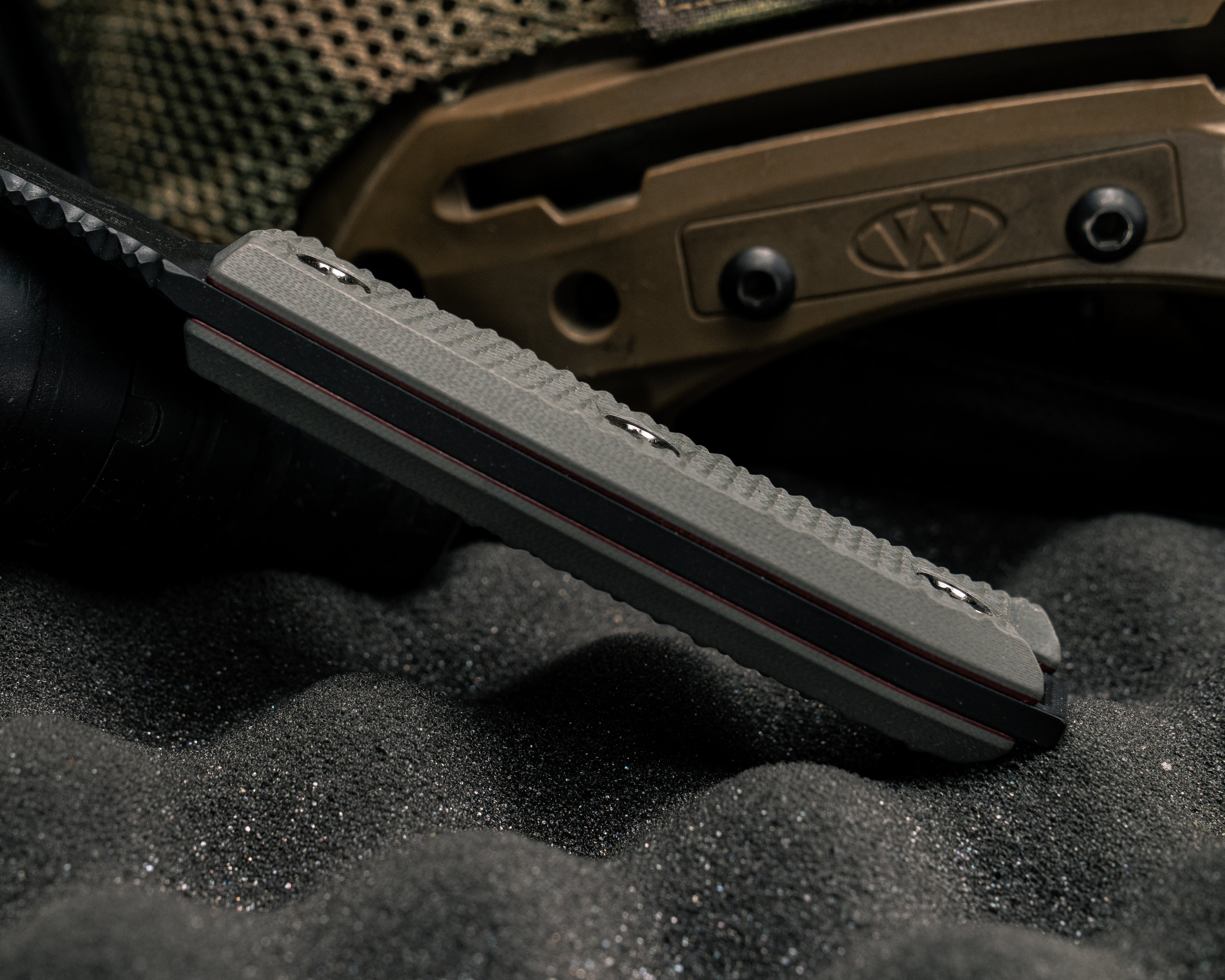 Ishi- Grey with Redline G10, Armor Black Cerakote, Ti Allen Bolts, Textured Grip