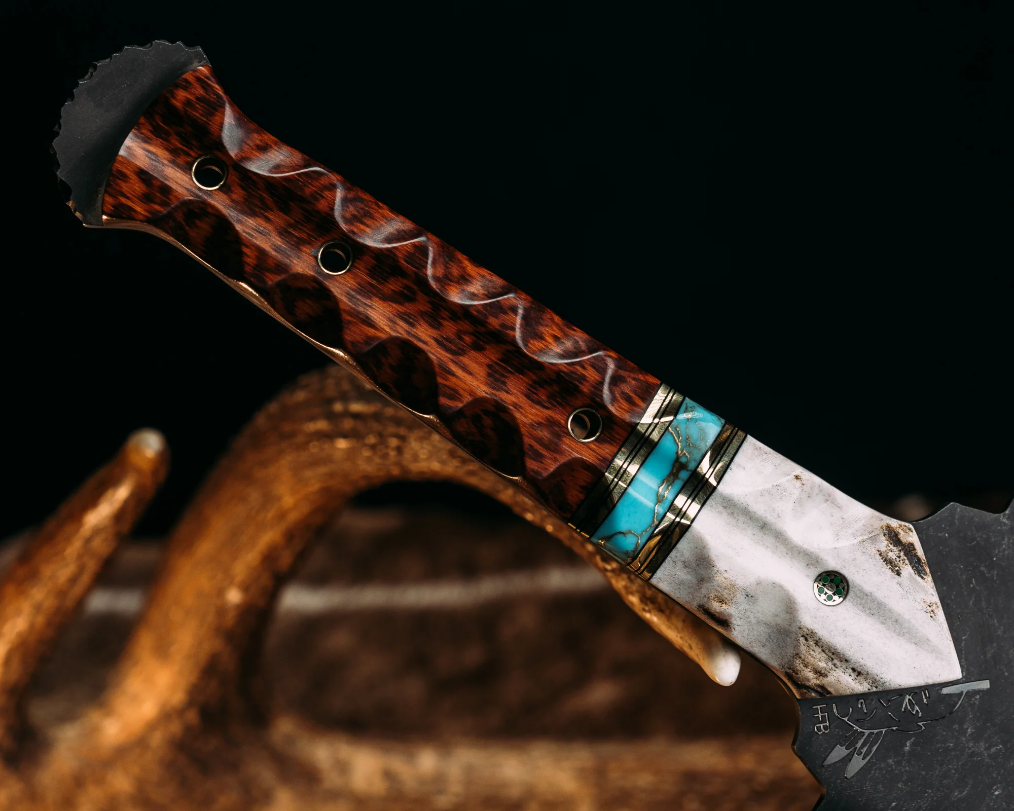 Macuahuitl- CO Elk Antler, Black G10 and Brass Pin Striping, Turquoise with Gold Web Tru-stone Split, Snakewood, Mosaic Pin, Brass Hollow Pins, Textured Grip